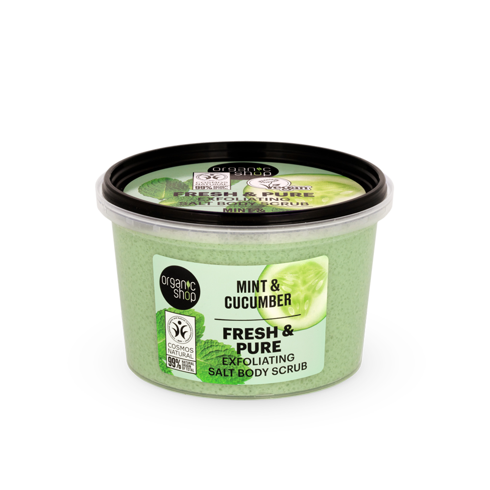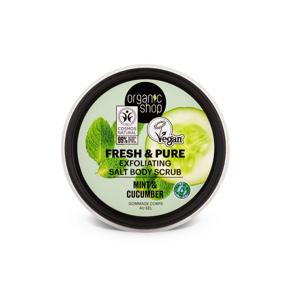Dive into an ocean of freshness with our Mint & Cucumber Body Scrub. Organic mint extract stimulates skin renewal and makes it incredibly smooth. Organic cucumber extract moisturizes the skin, giving it