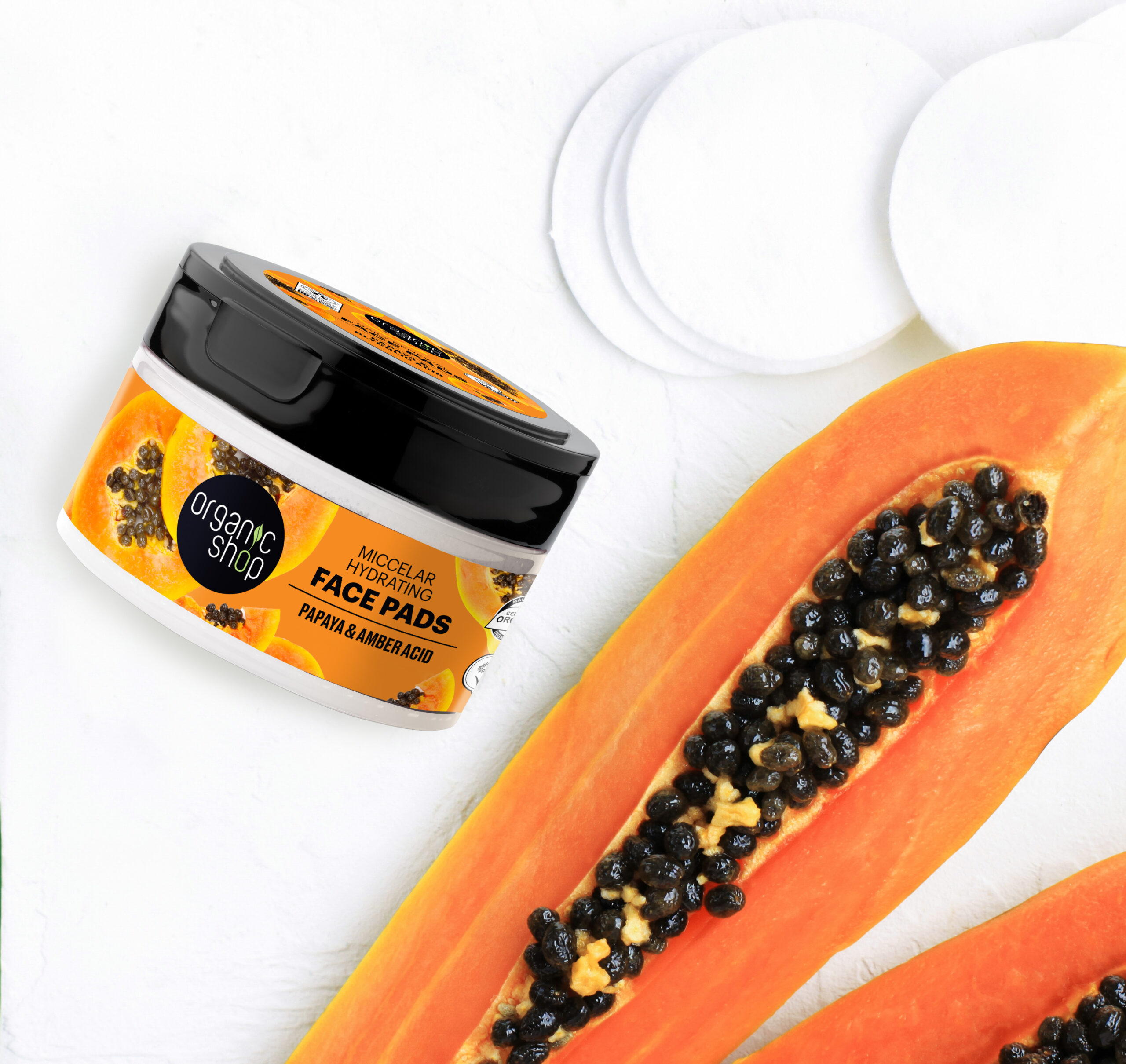 Give your skin a feeling of freshness and swipe away pore clogging dirt with our super effective face pads! Try this new beauty essential to hydrate skin, restore its natural healthy glow and to prolong skin youthfulness, while removing makeup! Organic Papaya Extract, rich in natural enzyme papain, perfectly exfoliates skin surface to support its renewal, while evening out skin tone. Hyaluronic Acid perfectly moisturises skin.
