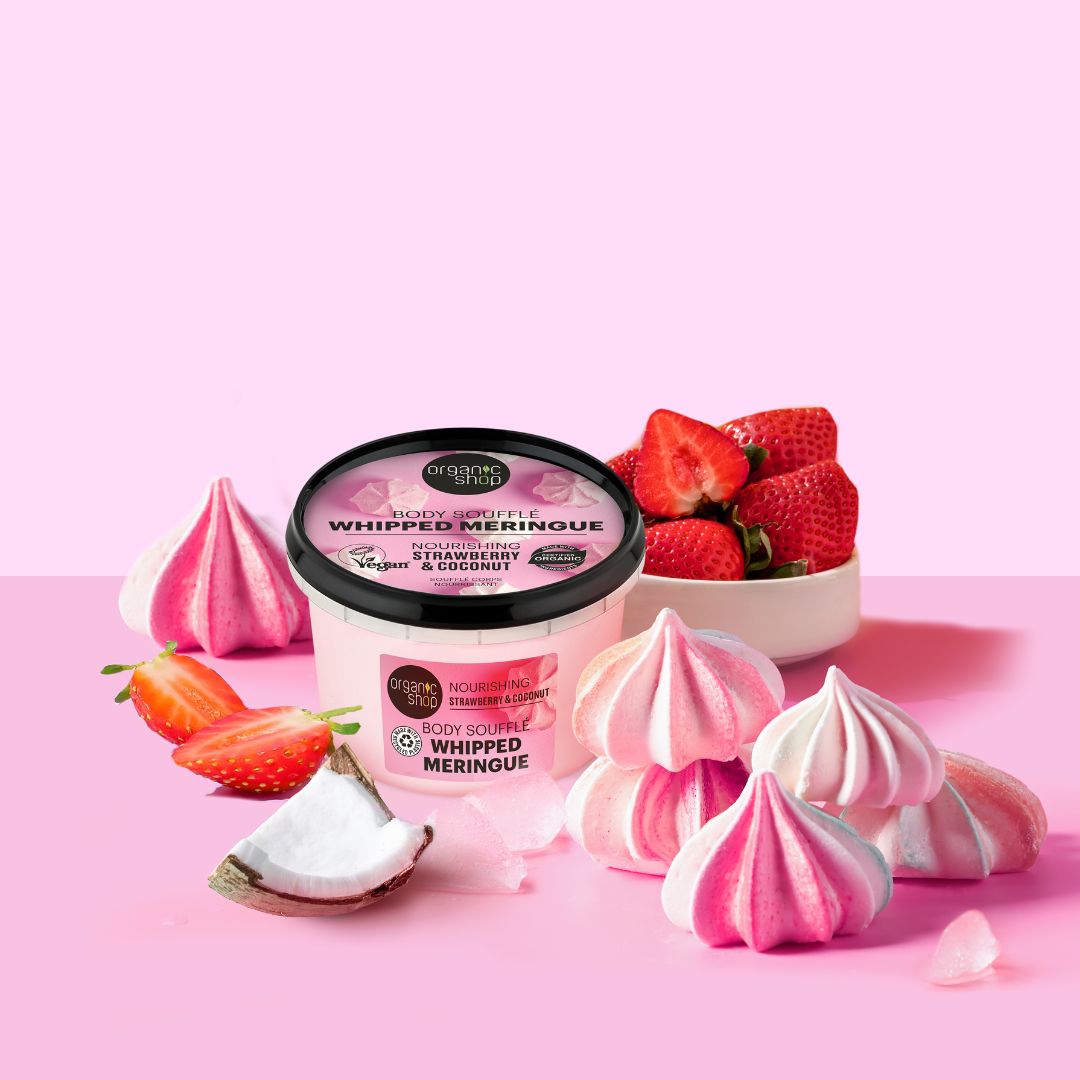 Try a tasty treat for your skin with nourishing body souffé! Delicate whipped texture like a sweet delicious meringue will delight your body and soul. Organic strawberry extract tones skin and makes it glow, while organic coconut oil offers a long-lasting nourishing effect.