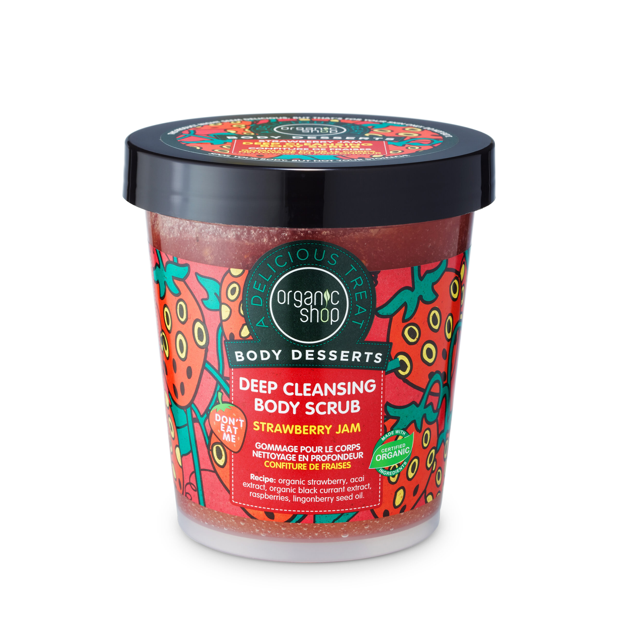Strawberry Jam Deep Cleansing Body Scrub limpia suavemente y renueva tu piel mientras llena tu mente de ensoñaciones veraniegas. El extracto de fresa orgánica nutre y calma la piel, mientras que el extracto de grosella negra orgánica y el acai ayudan a desintoxicar la piel. Las frambuesas y el aceite de semillas de arándano rojo proporcionan una limpieza profunda que deja la piel flexible y elástica.